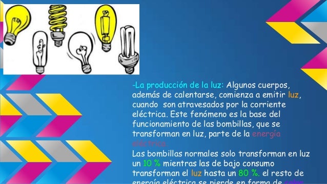 - 9. -La producción de la luz: Algunos cuerpos, además de calentarse, comienza a emitir luz, cuando son atravesados por la corriente eléctrica. Este fenómeno es la base del funcionamiento de las bombillas, que se transforman en luz, parte de la energía eléctrica. Las bombillas normales solo transforman en luz un 10 % mientras las de bajo consumo transforman el luz hasta un 80 %. el resto de
