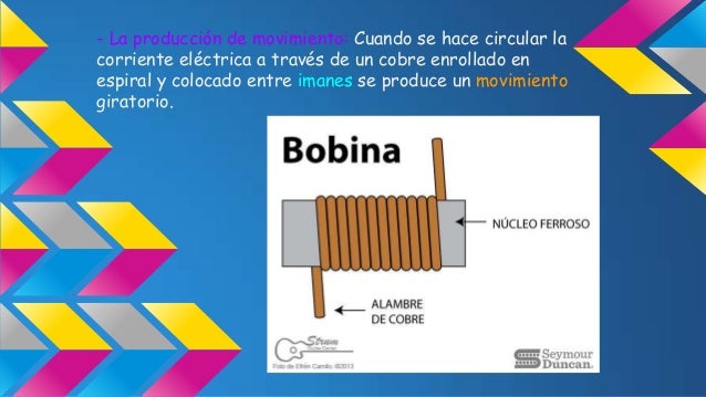 - 10. - La producción de movimiento: Cuando se hace circular la corriente eléctrica a través de un cobre enrollado en espiral y colocado entre imanes se produce un movimiento giratorio.