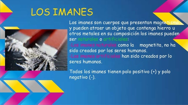 - 15. LOS IMANES Los imanes son cuerpos que presentan magnetismo y pueden atraer un objeto que contenga hierro u otros metales en su composición los imanes pueden ser naturales o artificiales: -Los imanes naturales como la magnetita, no ha sido creados por los seres humanos. -Los imanes artificiales han sido creados por lo seres humanos. Todos los imanes tienen polo positivo (+) y polo negativo (-).
