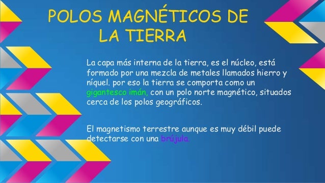 - 16. POLOS MAGNÉTICOS DE LA TIERRA La capa más interna de la tierra, es el núcleo, está formado por una mezcla de metales llamados hierro y níquel. por eso la tierra se comporta como un gigantesco imán, con un polo norte magnético, situados cerca de los polos geográficos. El magnetismo terrestre aunque es muy débil puede detectarse con una brújula.