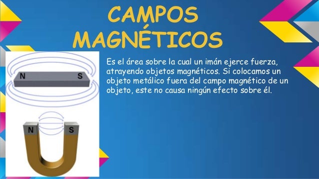 - 17. CAMPOS MAGNÉTICOS Es el área sobre la cual un imán ejerce fuerza, atrayendo objetos magnéticos. Si colocamos un objeto metálico fuera del campo magnético de un objeto, este no causa ningún efecto sobre él.