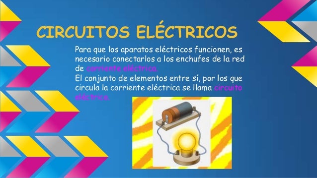 - 6. CIRCUITOS ELÉCTRICOS Para que los aparatos eléctricos funcionen, es necesario conectarlos a los enchufes de la red de corriente eléctrica. El conjunto de elementos entre sí, por los que circula la corriente eléctrica se llama circuito eléctrico.