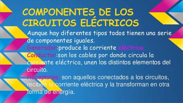 - 7. COMPONENTES DE LOS CIRCUITOS ELÉCTRICOS Aunque hay diferentes tipos todos tienen una serie de componentes iguales. Generador:produce la corriente eléctrica. Conductor:son los cables por donde circula la corriente eléctrica, unen los distintos elementos del circuito. Receptores: son aquellos conectados a los circuitos, reciben la corriente eléctrica y la transforman en otra forma de energía.